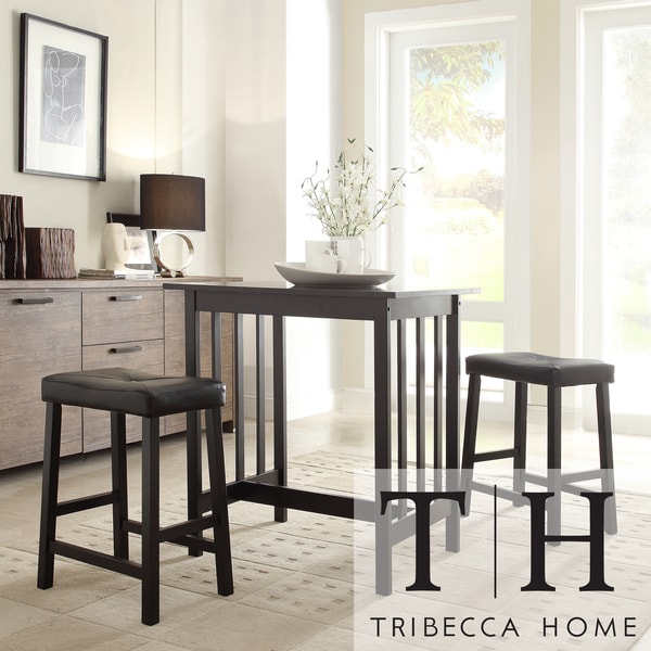 TRIBECCA HOME Nova Black 3-piece Kitchen Counter Height Dining Set This Nova counter height dining set is the perfect solution for a dining or work space. The three piece set is features black upholstered seats. Nova table and chairs set offers simplicity and versatility to enhance your dining areaDining set makes a fun addition to your smaller dining spaceThree-piece counter height furniture set features a sturdy table and two upholstered saddle-back stoolsDining set is constructed with solid wood with wood veneer and vinyl upholstered cushionSaddleseat stool designTable is excellent for work or diningPlush, upholstered saddle-back stoolsTable measures 32 inches wide x 24 inches long x 34 inches highEach chair measures 19 inches wide x 13 inches long x 24 inches highUpholstery color: BlackAssembly Required.
